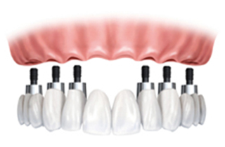 고정식 임플란트 브릿지와 부분 틀니를 병행하는 방식입니다. 전체 틀니보다 이물감이 덜 하고 틀니를 빼더라도 앞니는 고정되어 남아 있는 형태입니다.